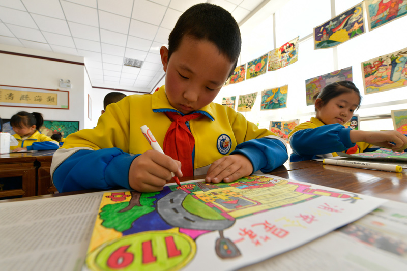 4月14日,在张掖市甘州区大成学校,学生创作国家安全教育相关的手抄报。
