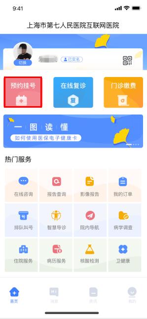 2、在互联网医院首页,点击【预约挂号】,进入挂号页面;
