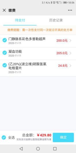 8、医生开单后首页点击【门诊缴费】,选择就诊人与就诊卡号查看待支付项目,选择确认后进行医保在线支付;