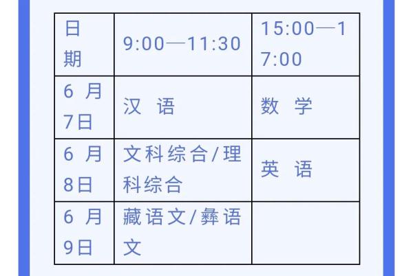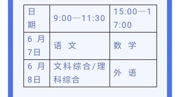 全省高考(一类模式高考除外)于6月7、8日统一组织进行。各科目考试时间(北京时间)安排如下: