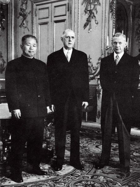 1964年6月,中国首任驻法国大使黄镇向戴高乐总统(中)递交国书后合影。