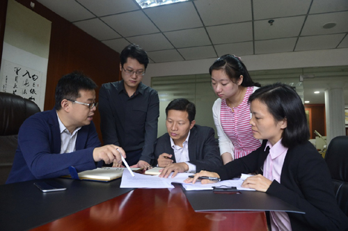 10月19日,在江西求正沃德律师事务所,两位江西省法律顾问团成员正在就案件进行讨论。从2014年9月开始,江西在全省建立法律顾问制度。通过分类推进普遍建立法律顾问制度,办事依法、遇事找法、解决问题用法、化解矛盾靠法的法治氛围正在形成。新华社记者 周密 摄