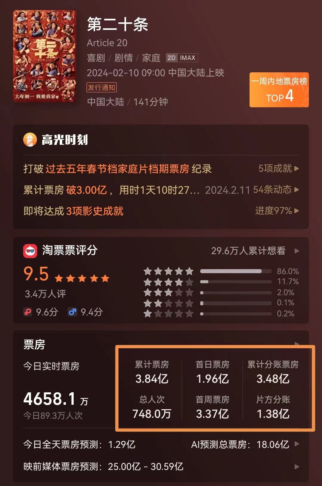 据灯塔专业版App,截至目前,《第二十条》累计票房3.84亿,观影总人次748万。