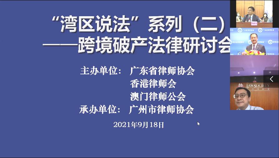 9月18日,由广东省律师协会、香港律师会、澳门律师公会主办,广州市律师协会承办的第二期“湾区说法”系列研讨会——跨境破产法律研讨会圆满举行。香港律师会会长陈泽铭、澳门律师公会主席华年达、广东省律师协会副会长陈方出席研讨会并致辞。本次研讨会首次采用线上线下相结合的形式举办,来自粤港澳三地近200名律师参加了研讨会。