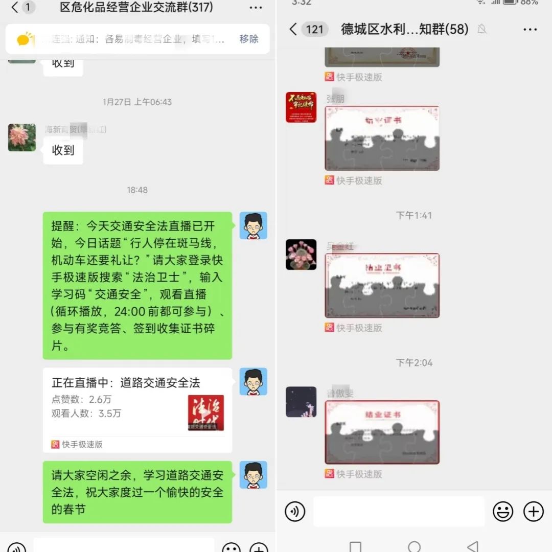 全新开局,新媒体开启线上法治宣传教育。将“德城司法行政”微信公众号更名“法治德城”,彰显法治建设大格局。持续发挥新媒体迅即优势,在“法治德城”先后转载“德律说法”短视频大赛获奖作品9篇,连续10天转载并发动2000余人次参与“未成年网络保护答题”。组织发动“法治迎新春 平安过大年”全民学法活动,广泛宣传发动群众积极参加。区水利局领导干部带头答题、签到得证书,区应急局、区卫健局发动企业、医疗系统职工广泛参与,新湖街道结合文明城市创建工作,发动社区综治网格转发参加,营造浓厚法治氛围。