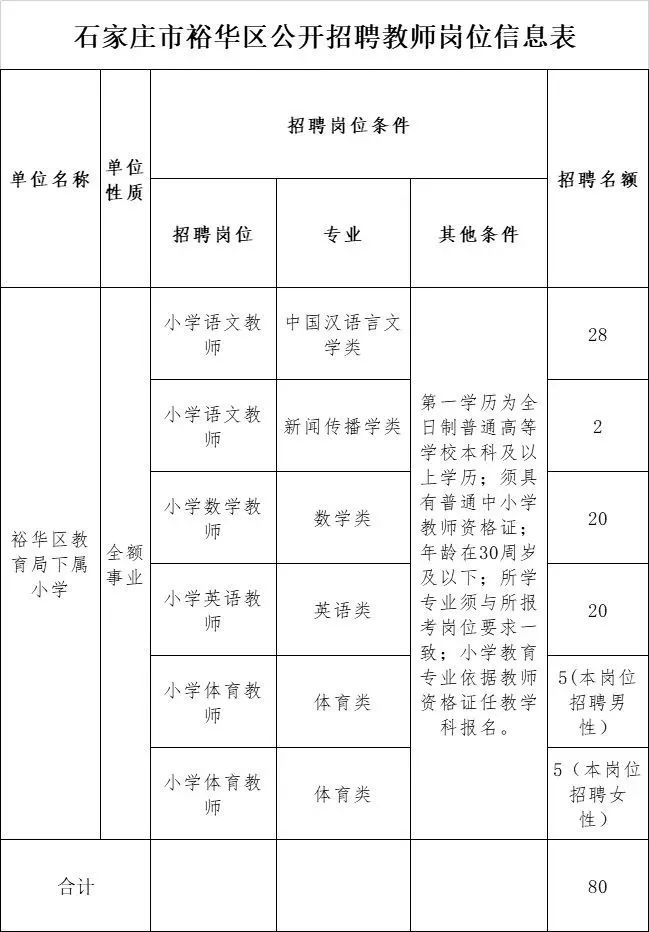 为加强教师队伍建设,提升教师队伍整体素质,全面提高教育教学质量和水平,石家庄市裕华区2019年面向社会公开招聘80名小学教师,现就有关事项公告如下: