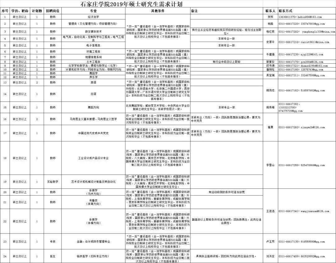 招聘岗位、人数、条件详见附件《石家庄学院2019年硕士研究生需求计划》(附件1)。