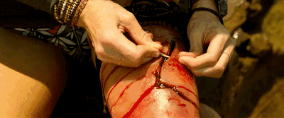 啊啊啊啊啊啊啊!看着真的好疼啊!女主角被鲨鱼咬了个大口子,忍痛用项链缝合伤口,还被咸咸的海水扑打,这么暴力的场面伤害了小十君的眼睛和心灵!
