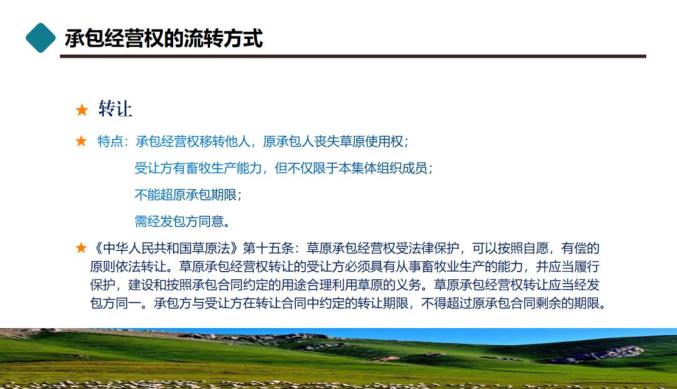 《中华人民共和国草原法》第十五条:草原承包经营权受法律保护,可以按照自愿,有偿的原则依法转让。草原承包经营权转让的受让方必须具有从事畜牧业生产的能力,并应当履行保护,建设和按照承包合同约定的用途合理利用草原的义务。草原承包经营权转让应当经发包方同一。承包方与受让方在转让合同中约定的转让期限,不得超过原承包合同剩余的期限。