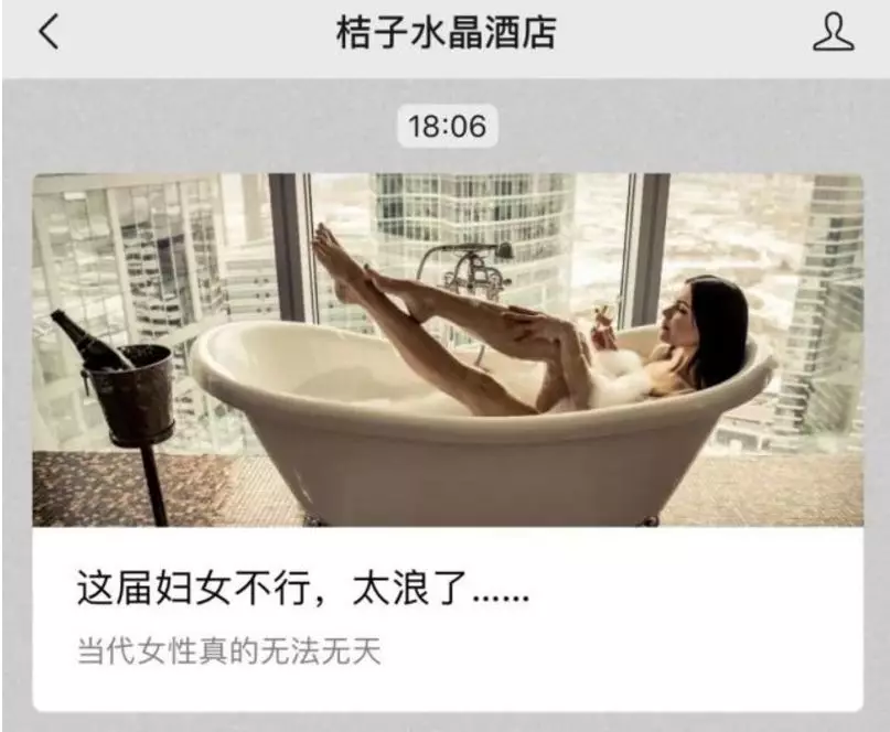 3月7日晚,三八妇女节前夜,“桔子水晶酒店”微信公众号发布了一条标题为《这届妇女不行,太浪了....。。》的推送,封面则被设置成了一名女性躺在浴缸里沐浴的图片。