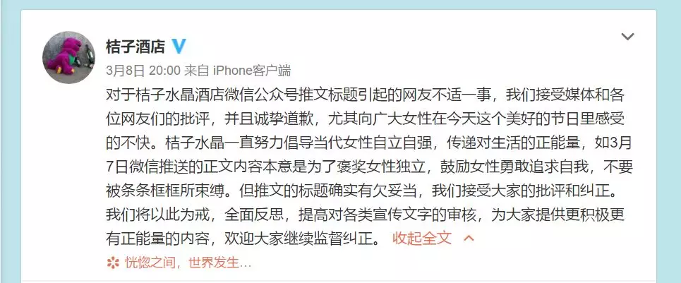 虽然桔子水晶酒店在官方微博发布的道歉声明中解释称,3月7日微信推送的正文内容本意是为了褒奖女性独立,鼓励女性勇敢追求自我,不要被条条框框所束缚。