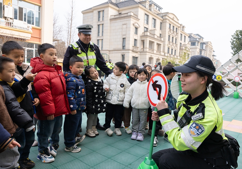 1月10日,交警在浙江省诸暨市城东幼儿园指导小朋友学习交通安全知识。