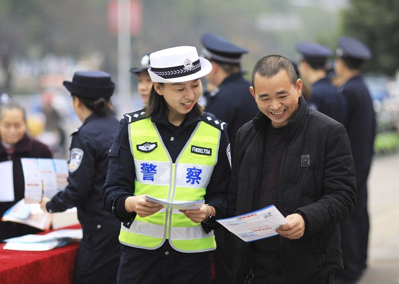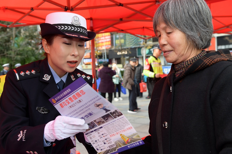 1月10日,在贵州省赤水市仁和广场,民警向市民宣传法律法规知识。