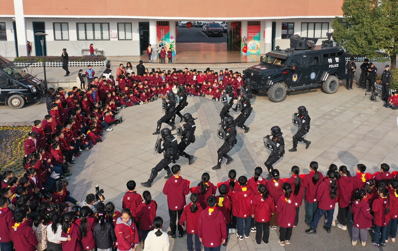 1月10日,浙江省东阳市江北二小操场上,东阳市公安局巡特警大队的队员在给学生展示防暴小队队形变换。