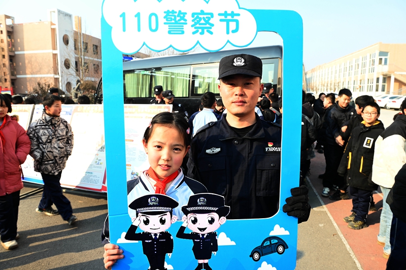 1月9日,河北省邯郸市肥乡区公安局特巡警大队与肥乡区毛演堡镇中心校联合举行迎接警察节主题宣教活动。这是学生与民警合影留念。