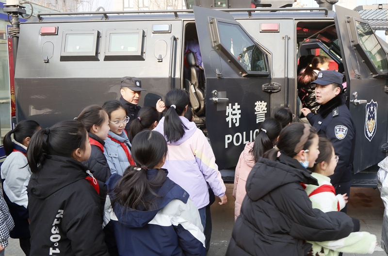 1月10日,河南省洛阳市汝阳县公安局举行警营开放日活动。这是汝阳县外国语小学的小学生在参观特警巡逻车。