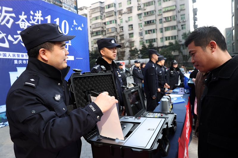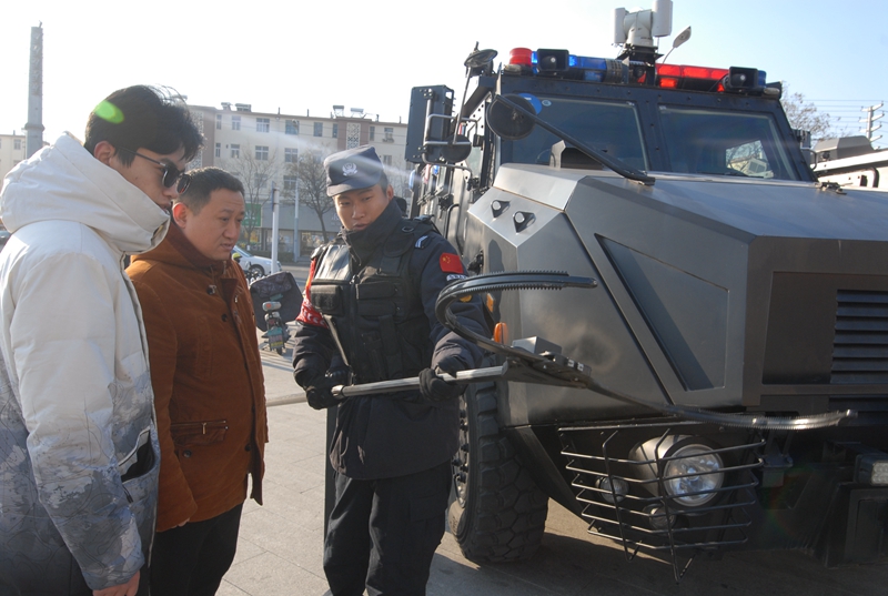 1月10日,在重庆市黔江区大十字广场,民警为市民介绍警用装备。