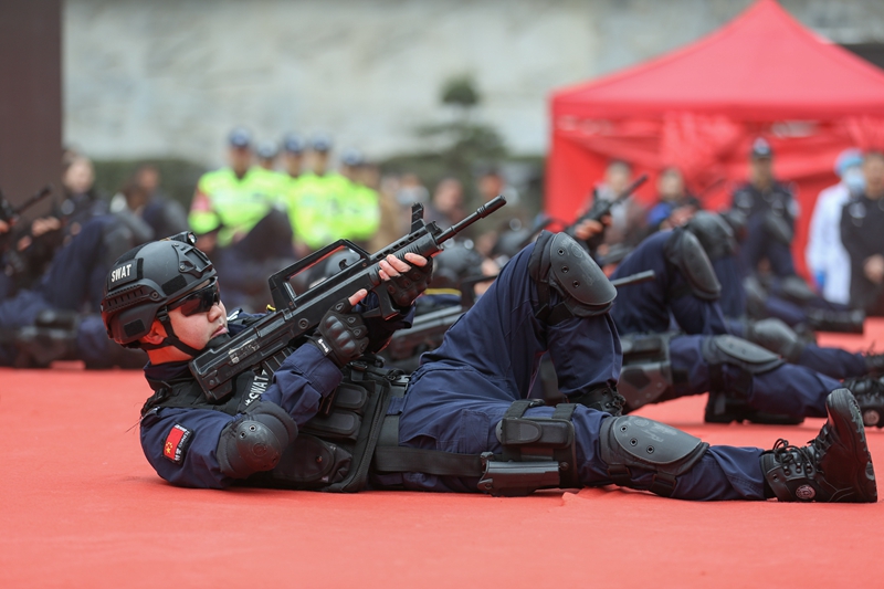 1月10日,在贵州省黔南布依族苗族自治州都匀市,特警队员在展示训练内容。