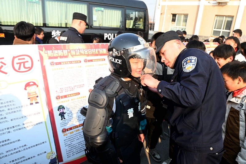 1月9日,河北省邯郸市肥乡区公安局特巡警大队与肥乡区毛演堡镇中心校联合举行迎接警察节主题宣教活动。这是学生在民警的指导下体验警用装备。