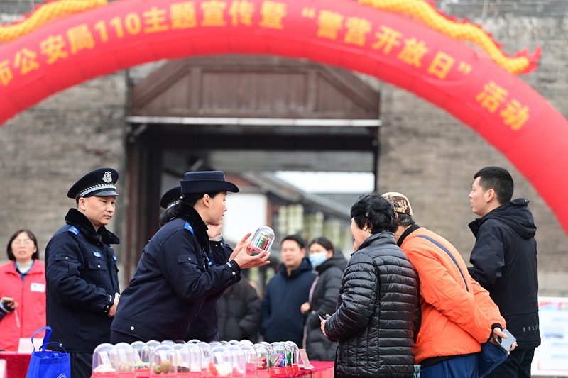 1月10日,江西省赣州市公安局在章贡区军门楼广场举行110主题宣传暨警营开放日活动。这是民警向市民宣讲禁毒安全知识。