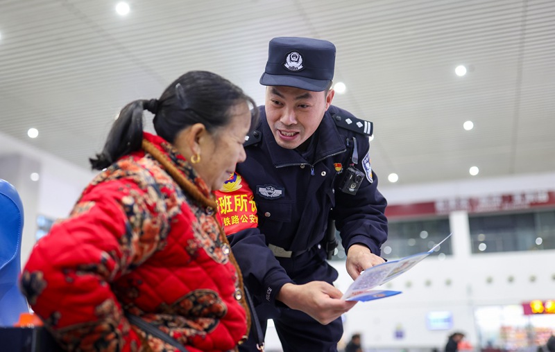 1月10日,成都铁路公安局贵阳公安处铜仁南车站派出所民警向旅客宣传铁路安全知识。