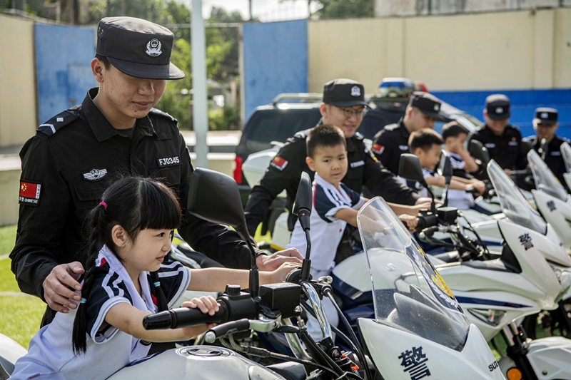 1月10日,在海南省琼海市,一家幼儿园的小朋友在警营体验警用摩托车。