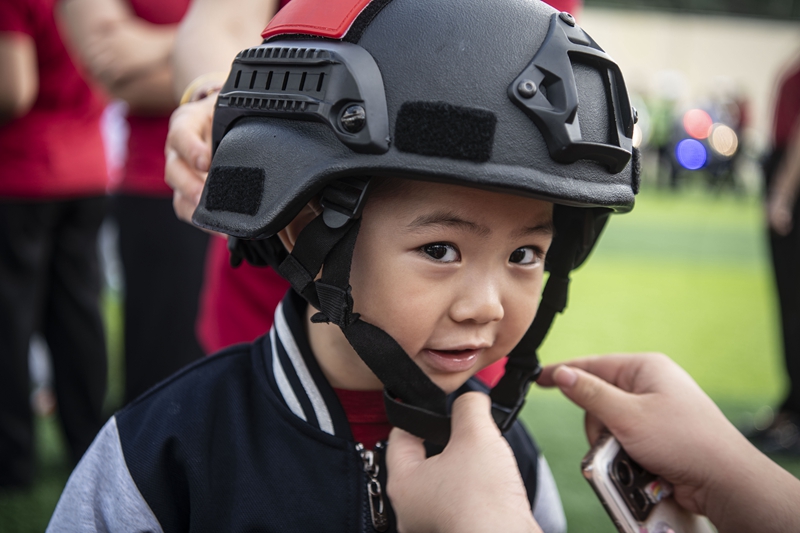 1月10日,在海南省琼海市,一家幼儿园的小朋友在警营试戴警帽。