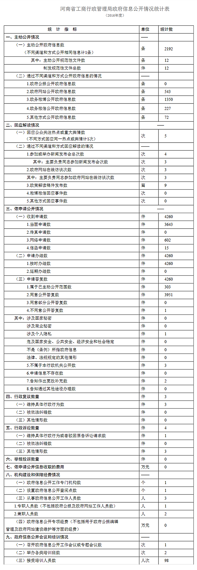 根据《中华人民共和国政府信息公开条例》和《河南省人民政府办公厅关于做好2016年政府信息与政务公开工作总结报送及年度报告编制和公布工作的通知》要求,现公布河南省工商行政管理局(以下简称:省工商局)2016年度政府信息公开工作年度报告。本报告内容包括概述、重点工作情况、宣传解读回应情况、信息公开数据(包含主动公开政府信息情况、依申请公开和不予公开政府信息情况、政府信息公开的收费及减免情况、因政府信息公开申请提起行政复议及行政诉讼情况)、存在的不足及改进措施。本报告中所列数据的统计期限自2016年1月1日起,至2016年12月31日止。