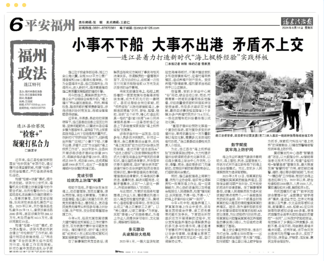 围绕着这一宏伟蓝图,近年来,连江县司法局躬耕“枫桥经验”,着眼涉海涉渔矛盾纠纷实际,创新工作方法,完善工作机制,把“枫桥经验”从“陆地”延伸到“海上”,探索实践新时代“海上矛盾纠纷调处机制”,精心打造“渔快调”148公共法律服务品牌。