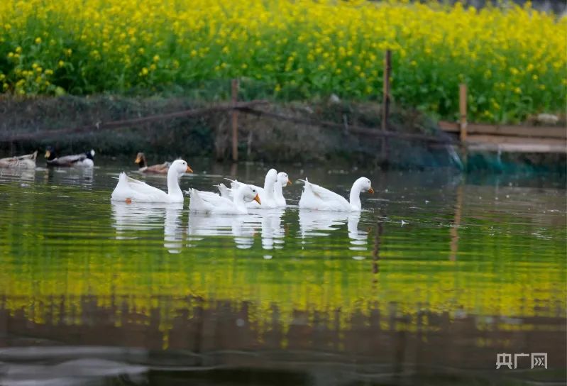 一群鸭子从油菜花旁游过(央广网发 吴光辉 摄)