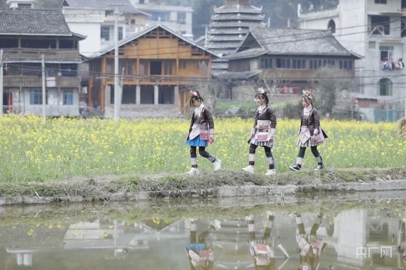 连日来,随着气温回暖,贵州省黔东南州黎平县侗寨里的油菜花竞相绽放,金色花海与农家吊脚楼、风雨桥、清水池塘相互映衬,美不胜收。暖阳下,花海里清香四溢、彩蝶纷飞,吸引众多游人前来观赏、打卡留念。