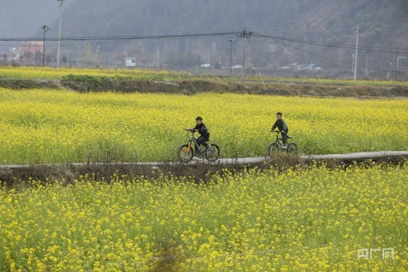 两名小孩在油菜花地骑车游玩(央广网发 吴光辉 摄)