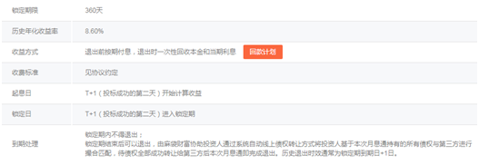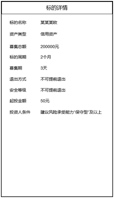 用户点击标的,可以进入到标的详情,具体如下,主要要包含标的的期限/起投金额/年化利率等等参数,根据合规要求,还要包含借贷项目详情/出借记录/资产说明/还款计划等等数据。