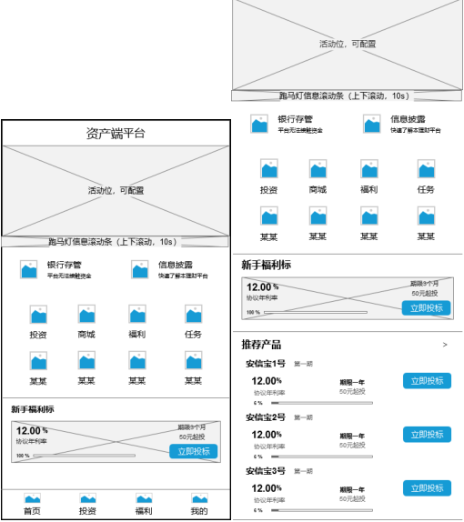 福利的页面可以放置一些商场/游戏/加息标专区/活动专区等等信息位,我的页面放置个人信息设置,投资标的数据等等。