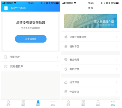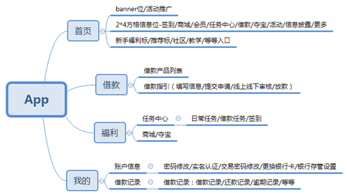 以宜人贷为例,App分为首页/帮助/我的/更多4个模块,具体如下: