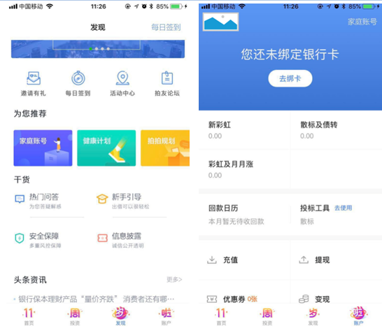 账户则有银行卡管理/投资数据/资金管理/帐单等
