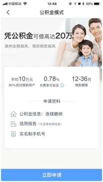 点击公积金产品,我们可以看到产品信息页及申请按钮,可想而知接下来就是资料填写和审批过程。