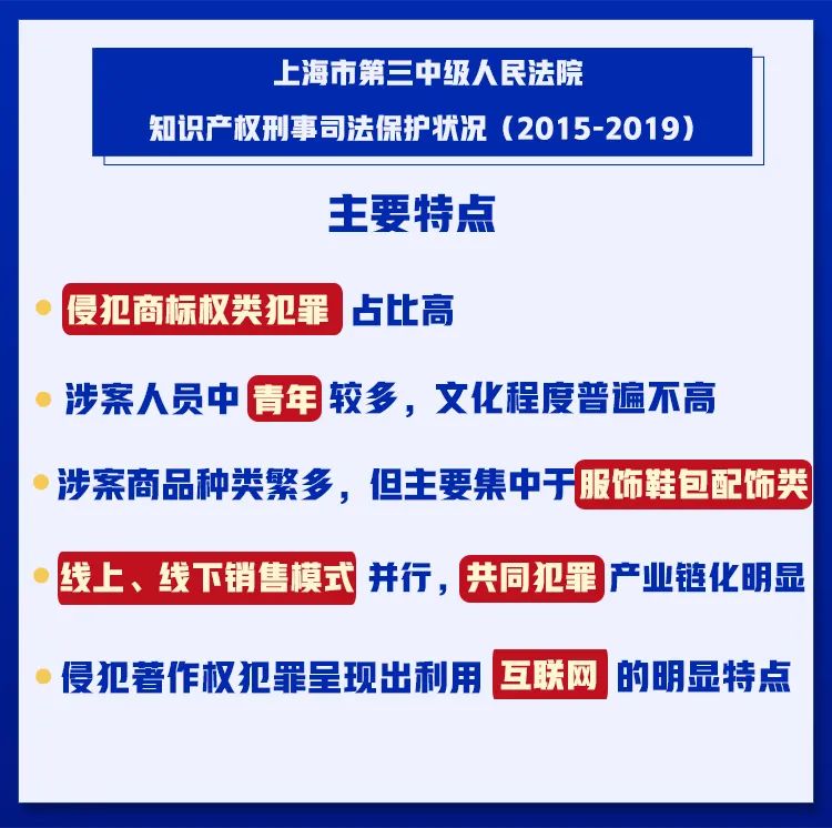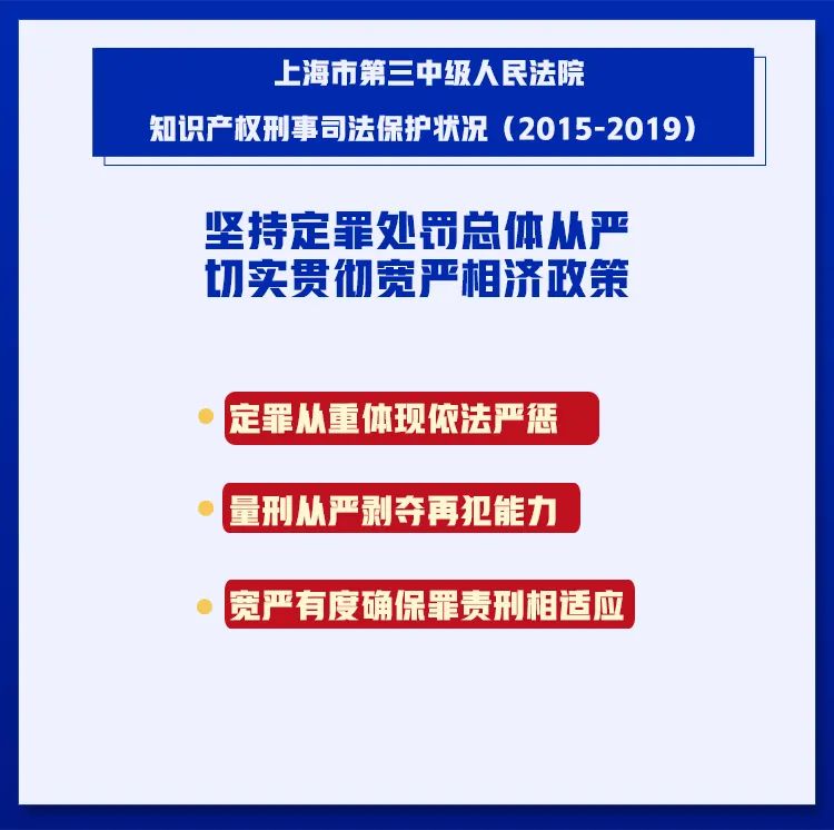 侵犯知识产权犯罪,不仅侵犯他人的智力品牌成果和财产利益,而且妨害国家知识产权管理秩序,严重阻碍国家创新驱动发展战略。上海三中院认真落实严格的知识产权司法保护制度,贯彻总体从严原则,把握宽严相济的刑事政策,实行区别对待。对主观恶性深、犯罪金额大、社会危害大的案件,坚持从严惩治的高压态势;对于主观恶性不深、情节较轻、社会危害不大的案件,依法从宽处罚。