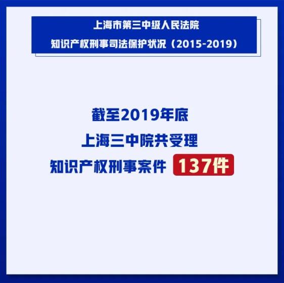 五年来,上海三中院充分发挥刑事审判职能,依法办理各类知识产权刑事案件,有力彰显了严厉打击侵犯知识产权犯罪的态度和成效。截至2019年底,上海三中院共受理知识产权刑事案件137件,其中一审案件52件,二审案件77件,其他案件8件。