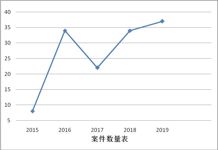 从每年收案变化情况看,2015年受理知识产权刑事案件8件,2016年受理34件,2017年受理22件,2018年受理34件,2019年受理39件。(见图1)