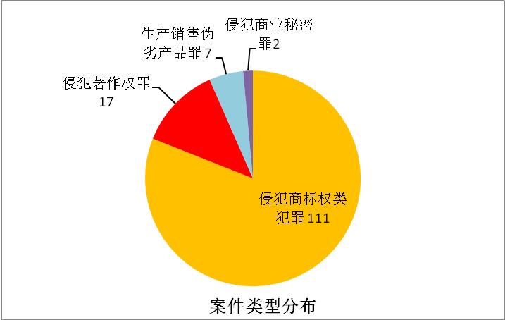 1.侵犯商标权类犯罪占比高。受理的知识产权刑事案件中,主要涉及销售假冒注册商标的商品罪、假冒注册商标罪、侵犯商业秘密罪、生产销售伪劣产品罪、侵犯著作权罪和非法制造、销售非法制造的注册商标标识罪等6个罪名。其中,侵犯商标权类案件占绝大多数,共111件,占总数的81.02%;侵犯著作权罪案件呈逐年上升趋势,共17件,占总数的12.41%;生产销售伪劣产品罪案件7件,占总数的5.11%;侵犯商业秘密罪案件2件,占总数的1.46%。(见图2)