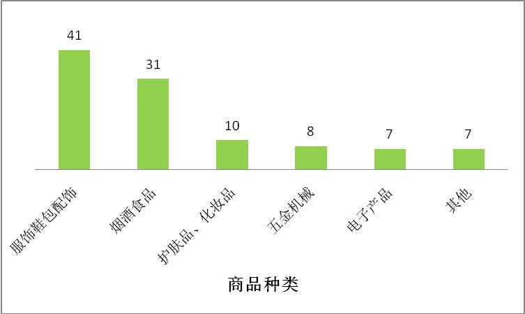 3.涉案商品种类繁多,但主要集中于服饰鞋包配饰类。侵犯商标权类以及伪劣产品案件中,涉及的商品种类繁多,包括烟酒饮用水等食品类、服饰鞋包配饰类、护肤化妆品类、电子产品类、五金机械类及其他。(见图3)其中,制假售假商品最多的是服饰鞋包配饰类,占到案件总数的39.4%,烟酒饮用水等食品类其次,占总数的29.8%。涉及的品牌有LV、CHANEL、PRADA、NIKE、adidas、LOREAL等,这些品牌在国内外声誉较高、影响较大,惩治呼声高。