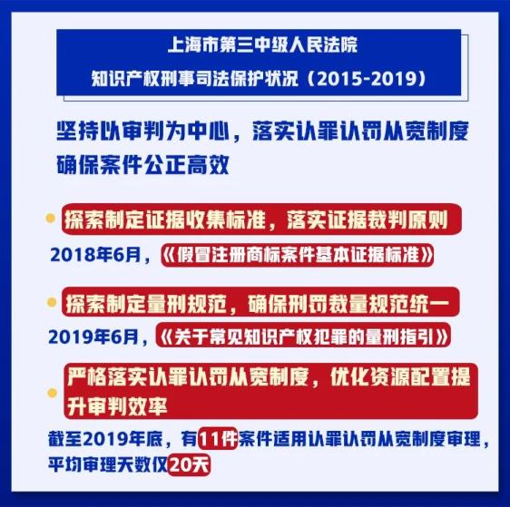 3.严格落实认罪认罚从宽制度,优化资源配置提升审判效率。上海三中院自2016年起开展认罪认罚从宽制度改革试点,2018年初开始在知识产权刑事案件审理中实施。在适用过程中,上海三中院严格落实《刑事诉讼法》以及《关于适用认罪认罚从宽制度的指导意见》的相关规定,坚持在送达起诉书副本和庭审时两次征询被告人认罪认罚的真实性、自愿性,询问签署《认罪认罚具结书》时律师是否在场、是否明知认罪认罚的法律后果,并充分保障被告人的辩护权和最后陈述权,确保被告人认罪认罚的真实性、自愿性、明知性。截至2019年底,有11件案件适用认罪认罚从宽制度审理,平均审理天数仅20天,仅有1件上诉,既促进案件繁简分流,提高了审判效率,节约了司法资源,同时也有利于法律效果和社会效果的有机统一。