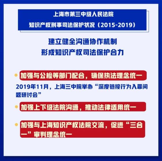 1.加强与公检等部门配合,确保执法理念统一。打击知识产权犯罪,有赖于侦查、检察、审判等三机关的协作配合。为统一裁判标准、执法理念,强化各职能部门的沟通协作,五年来,上海三中院与上海市人民检察院第三分院、上海市公安局、上海海关等相关部门召开多次座谈会和研讨会,就类案中出现的执法标准、法律适用问题,特别是新类型案件中出现的入罪标准、证据把握等问题进行研讨、沟通,统一认识。2019年11月,上海三中院举办“深度链接行为入罪问题研讨会”,邀请相关部门和知识产权领域专家学者,围绕深度链接行为能否构成犯罪、构罪的标准及证据采信等问题展开深入讨论,广泛听取意见,形成深度链接行为模式、实质危害、入罪路径、证据标准等方面的共识,取得了预期效果。