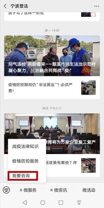 宁波市司法局依托“宁波普法”微信公众号,在公众号“微服务”设置“我要咨询”栏目。提供了视频咨询、法律意见书、法律援助在线申请、赔偿计算器、文书模版等法律援助功能。通过手机可直接连线到宁波市法律援助中心值班律师,完成实时咨询。后台还有“机器人问答”智能机器人提供7×24小时的法律智能问答服务。
