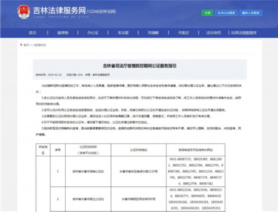 在“吉林法律服务网”设置“疫情防控法律服务专区”;加强“12348吉林法律服务热线”疫情防控法律咨询力量;公布全省法律援助、司法鉴定、公证和仲裁等法律服务机构的咨询预约服务电话……