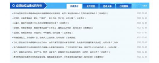 该版块设有法律责任、生产经营、劳动人事、行政管理4个方面的法律知识问题,由法律专家团队搜集整理编写了疫情防控期间公民权利与义务、劳动纠纷、合同纠纷、行政执法、法律责任等方面可能会遇到的法律问题,帮助社会各界和人民群众依法防控,依法保障合法权益。