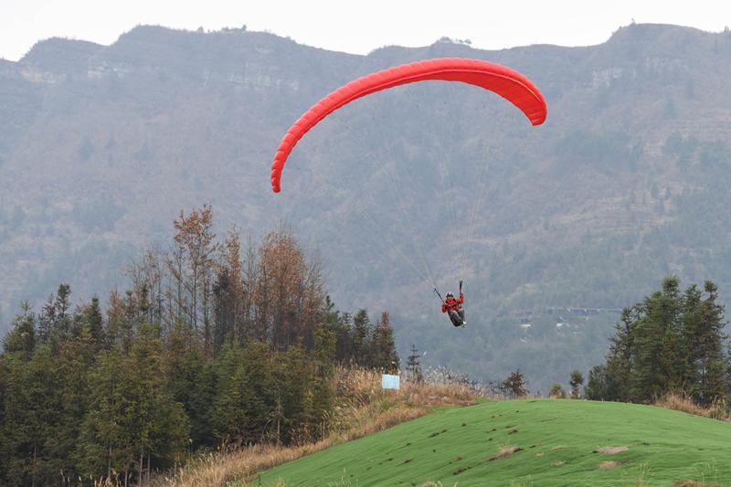 2月16日,游客在贵州省黔东南苗族侗族自治州黄平县旧州镇体验滑翔伞。