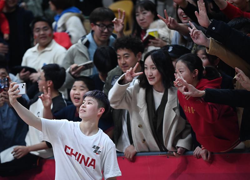 2月11日,中国队球员李缘在2024国际篮联奥运女篮资格赛中国队战胜波多黎各队的比赛后与球迷合影。春节期间,众多球迷选择观看比赛度过假期。