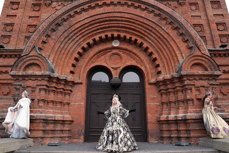 2月16日,旅拍游客在哈尔滨建筑艺术广场留影。
